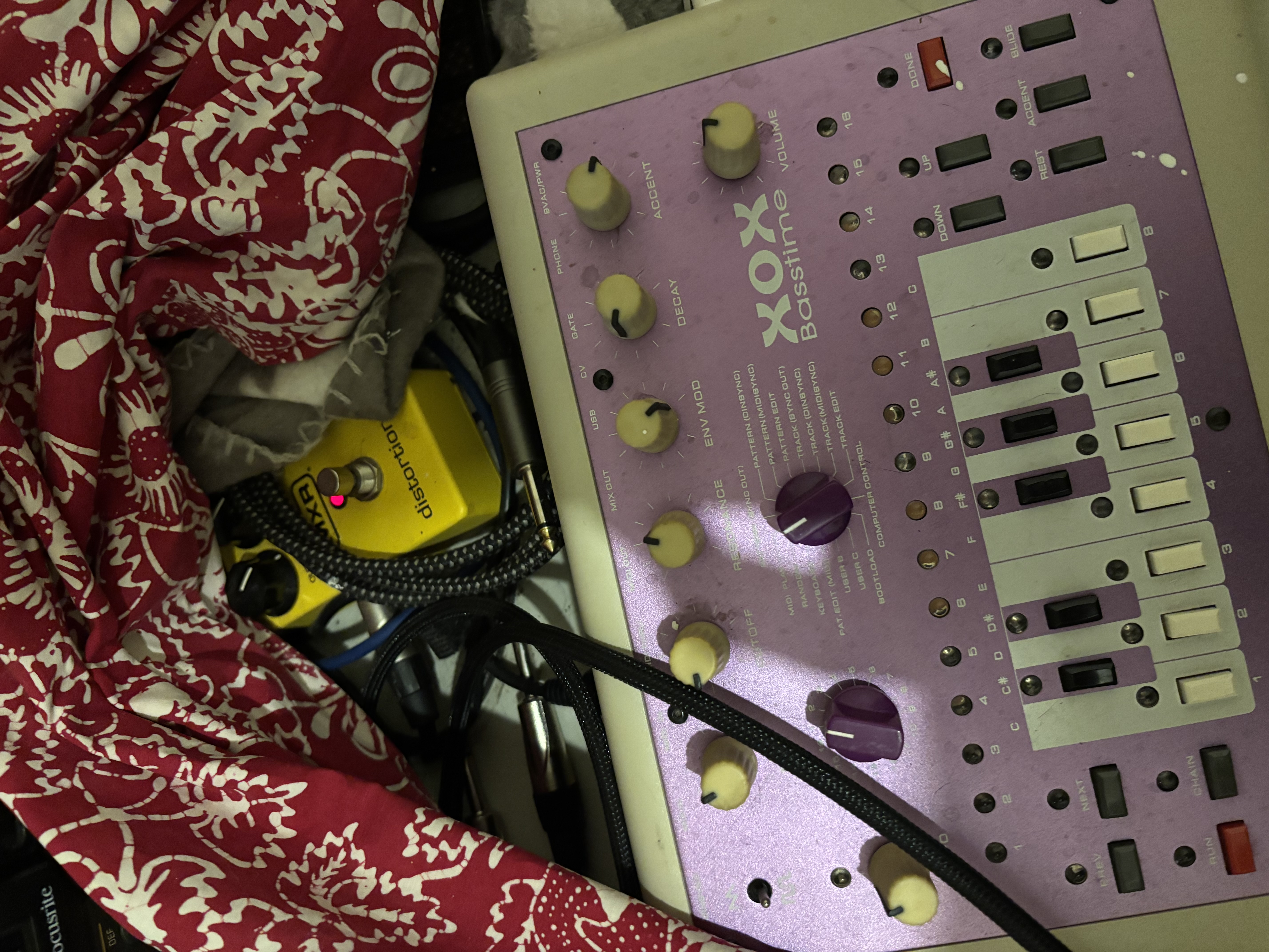 j'ai aussi cette MXR Distortion+ derriere ma TB-303 MIDI. (x0xb0x LAdyAda DIY d'occaze à 300 balles... les autres xox c'est de la m.... !)
